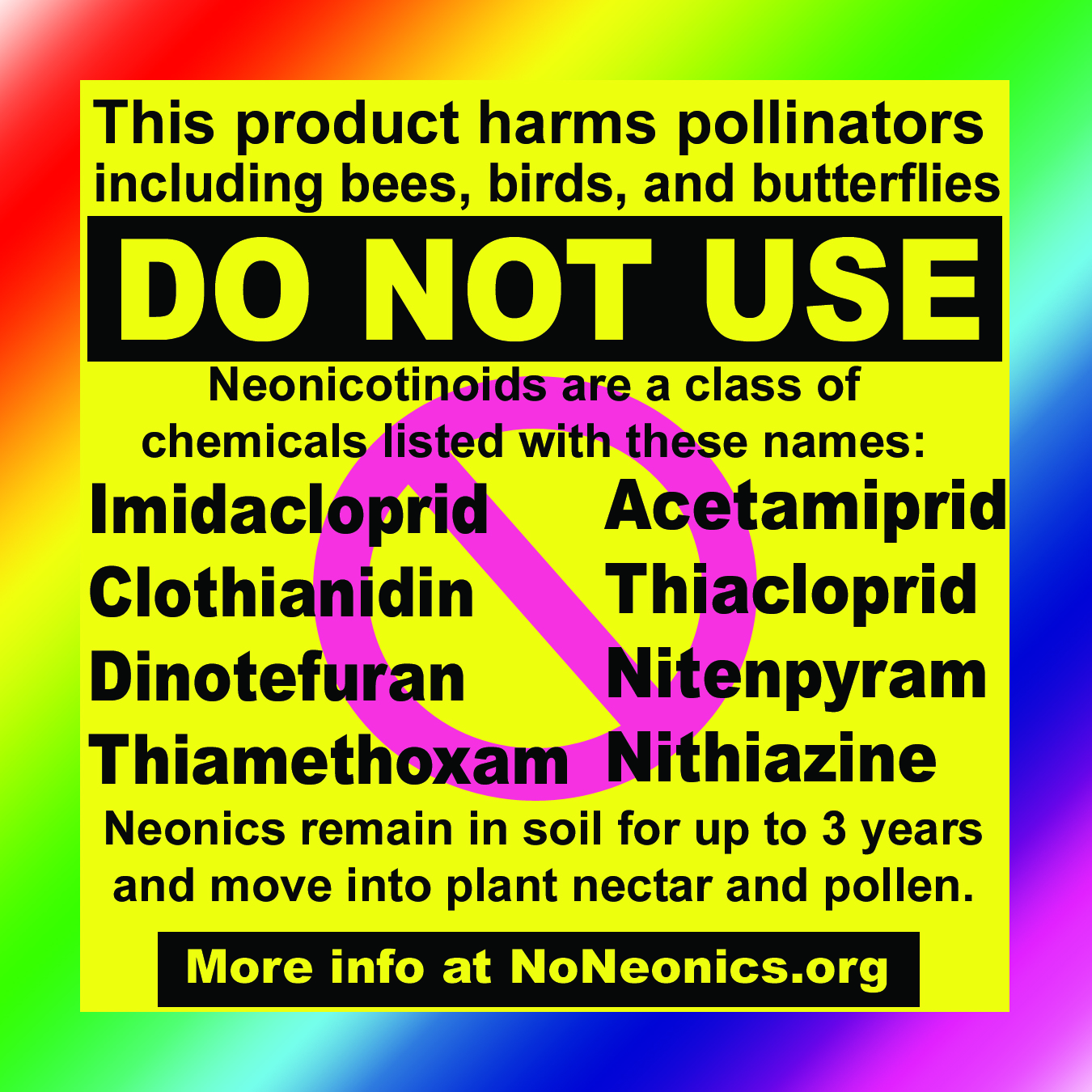 There are also files below for home printing. There is a .pdf and a .jpg file of an 8.5 by 11 sheet that can be printed on paper or sticker paper. If you print it on regular paper just use clear packing tape to stick to a bottle that containes neonics.